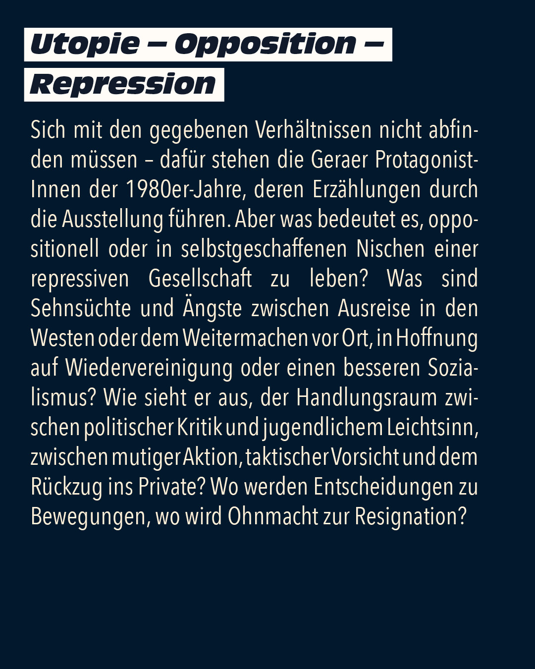 Sich mit den gegebenen Verhältnissen nicht abfinden müssen – dafür stehen die Geraer ProtagonistInnen der 1980er-Jahre, deren Erzählungen durch die Ausstellung führen. Aber was bedeutet es, oppositionell oder in selbstgeschaffenen Nischen einer repressiven Gesellschaft zu leben? Welche Sehnsüchte und Ängste bestimmen den inneren Konflikt zwischen Ausreise in den Westen und dem Weitermachen vor Ort, zwischen Hoffnung auf Wiedervereinigung und einen besseren Sozialismus? Wie sieht er aus, der Handlungsraum zwischen politischer Kritik und jugendlichem Leichtsinn, zwischen mutiger Aktion, taktischer Vorsicht und dem Rückzug ins Private? Wo werden Entscheidungen zu Bewegungen, wo wird Ohnmacht zur Resignation?