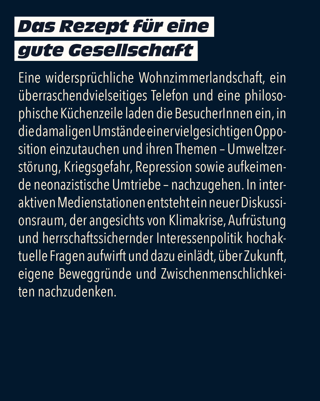 Eine widersprüchliche Wohnzimmerlandschaft, ein überraschend vielseitiges Telefon und eine philosophische Küchenzeile laden die BesucherInnen ein, in die damaligen Umstände einer vielgesichtigen Opposition einzutauchen und ihren Themen – Umweltzerstörung, Kriegsgefahr, Repression sowie aufkeimende neonazistische Umtriebe – nachzugehen. In interaktiven Medienstationen entsteht ein neuer Diskussionsraum, der angesichts von Klimakrise, Aufrüstung und herrschaftssichernder Interessenpolitik hochaktuelle Fragen aufwirft und dazu einlädt, über Zukunft, eigene Beweggründe und Zwischenmenschlichkeiten nachzudenken.